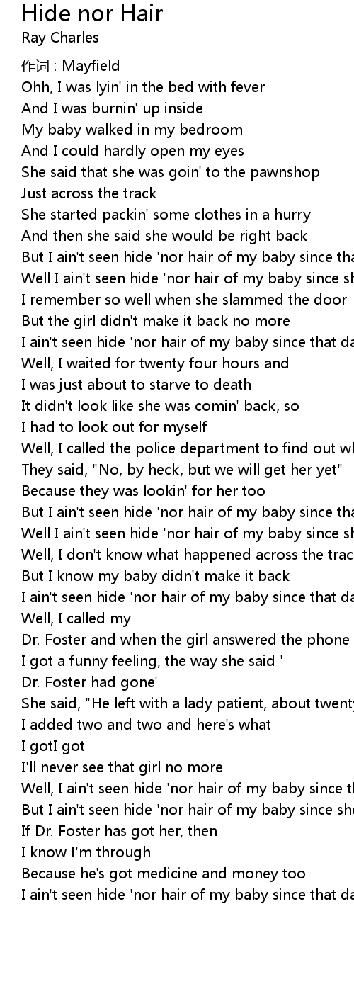 | Well I ain't seen hide 'nor hair of my baby since she went away | |