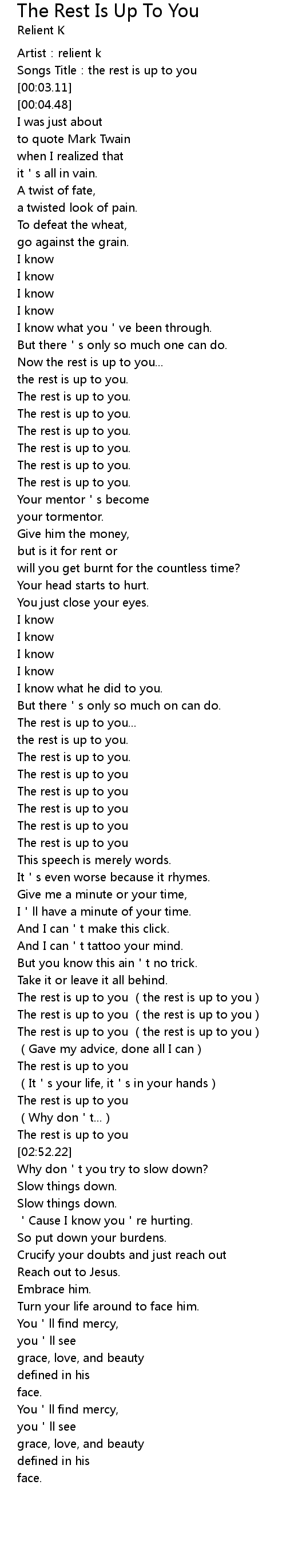 | [00:01.55] | Songs Title:the rest is up to you |