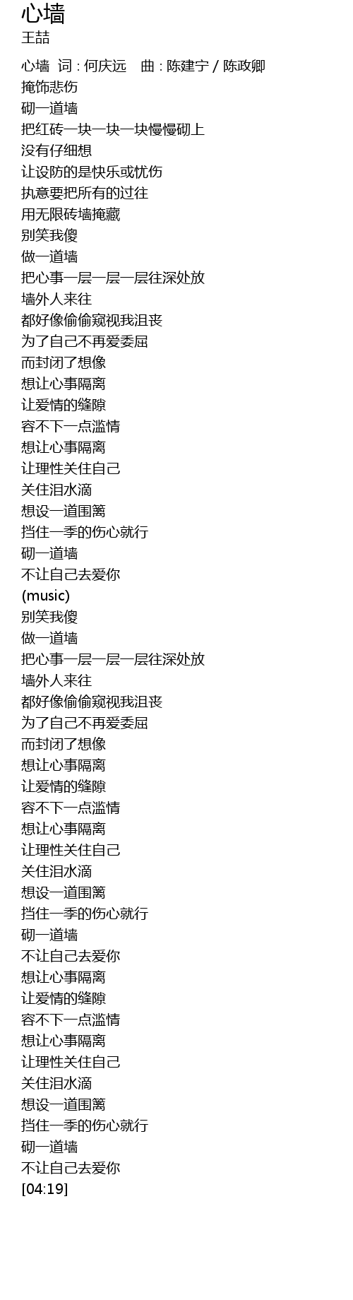 | [00:00] | 心墙 词∶何庆远 曲∶陈建宁/陈政卿 |