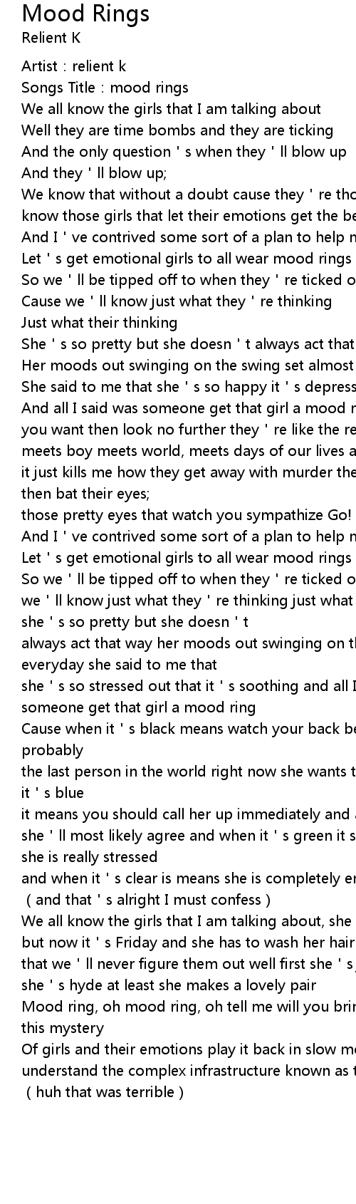 | [00:33.61] | Let s get emotional girls to all wear mood rings |