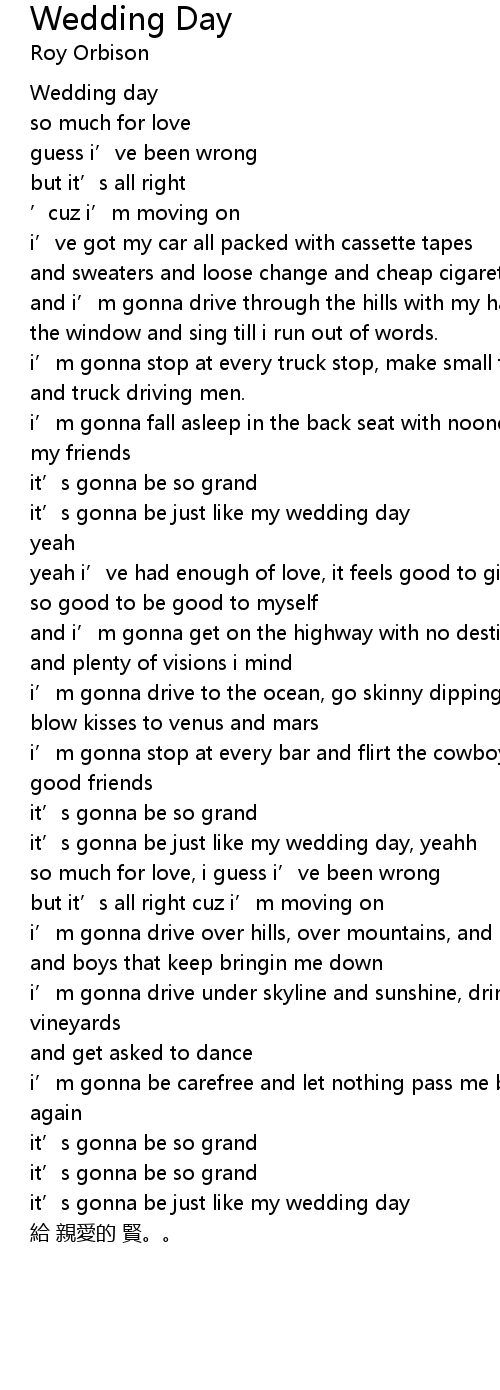 | [04:17.35] | it' s gonna be just like my wedding day |