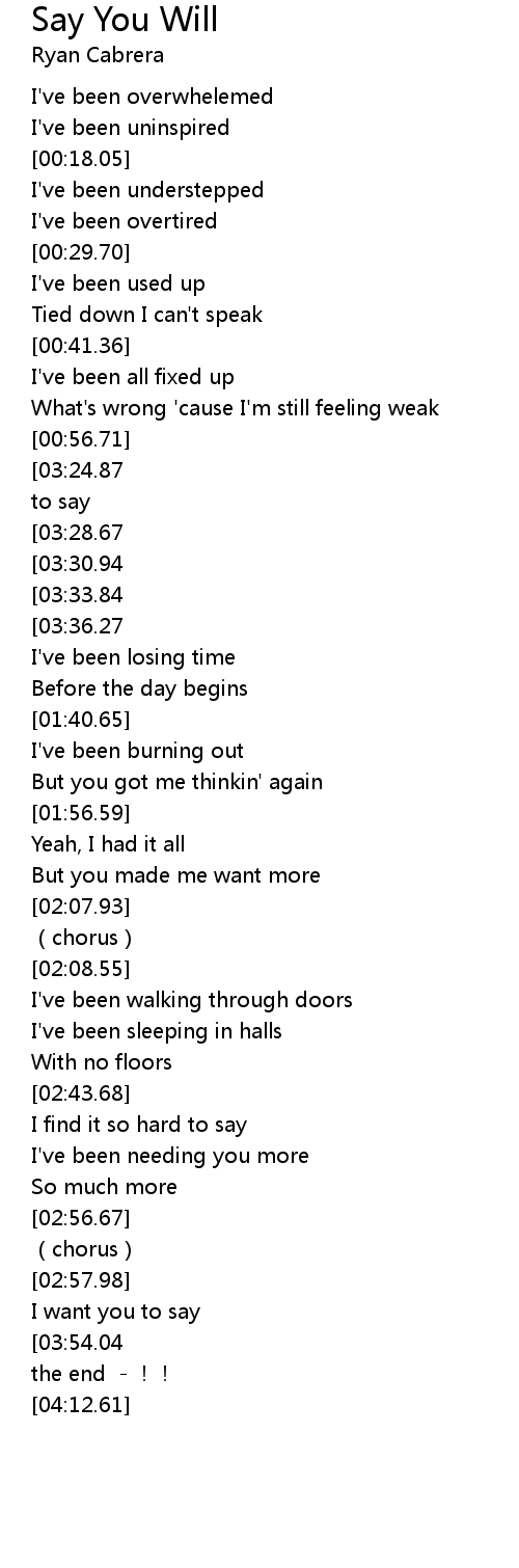 | [03:42.63][03:30.94][03:19.20][02:25.52][02:15.12][01:14.64][01:03.84] | You will |