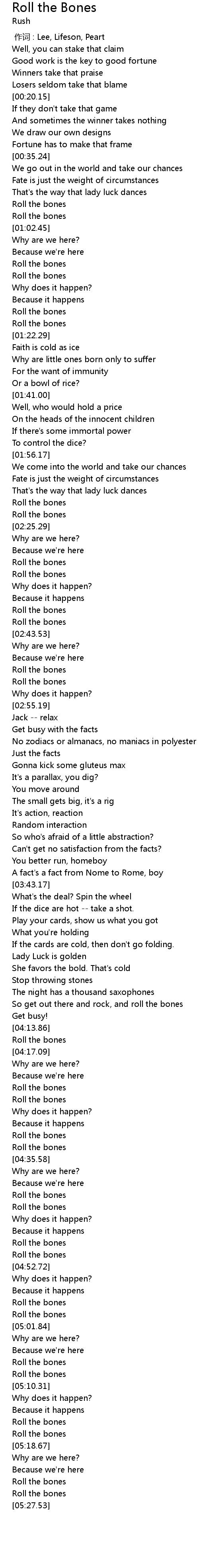 | [04:08.28] | So get out there and rock, and roll the bones |
