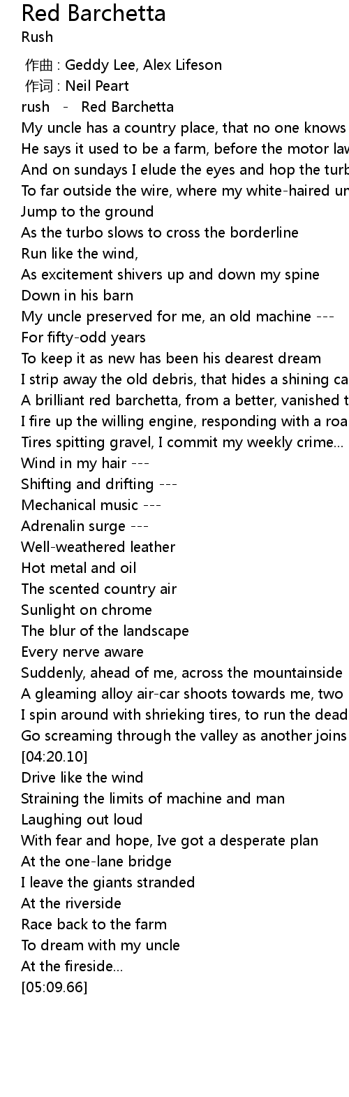 | [02:06.34] | A brilliant red barchetta, from a better, vanished time |