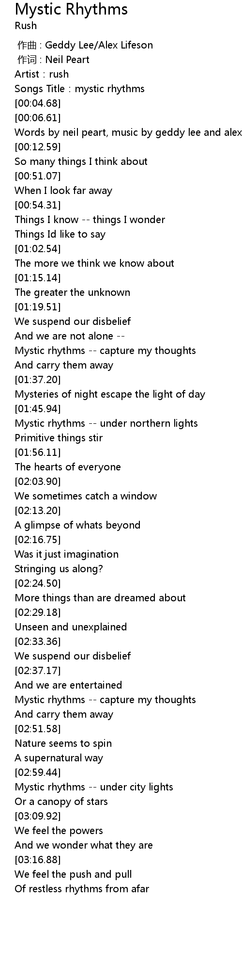 | [02:45.72] | Mystic rhythms -- capture my thoughts |