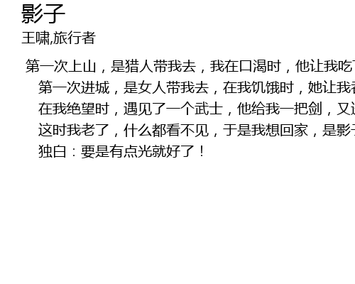 | 这时我老了,什么都看不见,于是我想回家,是影子背我回去,从此我开始重新摸索一切,重新开始一切。 | |