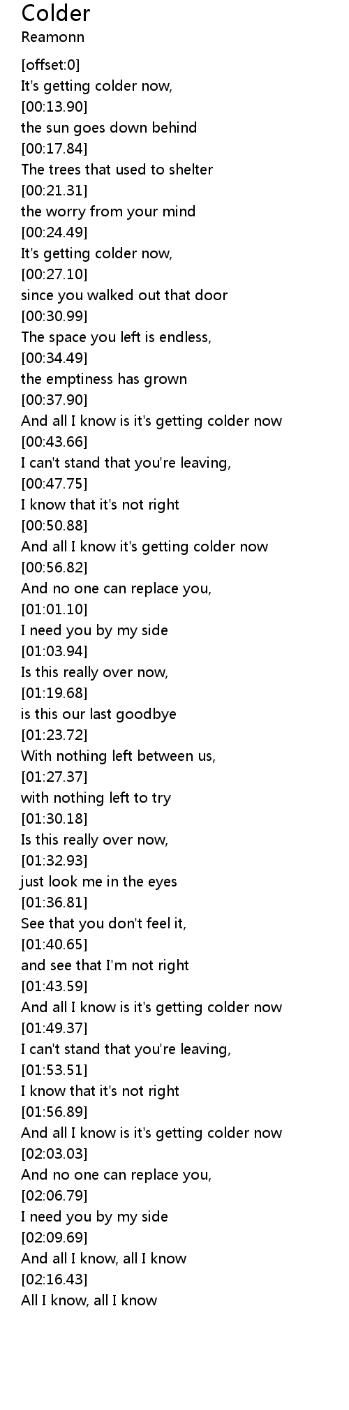 | [01:58.51] | And all I know is it's getting colder now |