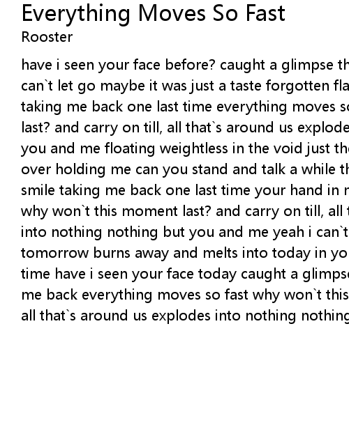 have i seen your face before? caught a glimpse then hit floor moving backwards, can`t let go maybe it was just a taste forgotten flavour that i can`t replace taking me back one last time everything moves so fast why won`t this moment last? and carry on till, all that`s around us explodes into nothing nothing but you and me floating weightless in the void just the whisper of you voice washing over holding me can you stand and talk a while thought that i`d forgotten how to smile taking me back one last time your hand in mine everything moves so fast why won`t this moment last? and carry on till, all that`s around us explodes into nothing nothing but you and me yeah i can`t find the time to try for me tomorrow burns away and melts into today in your eyes i can hide i`m just losing time have i seen your face today caught a glimpse then hit the floor you taking me back everything moves so fast why won`t this moment last? and carry on till, all that`s around us explodes into nothing nothing but you and me (x2) |