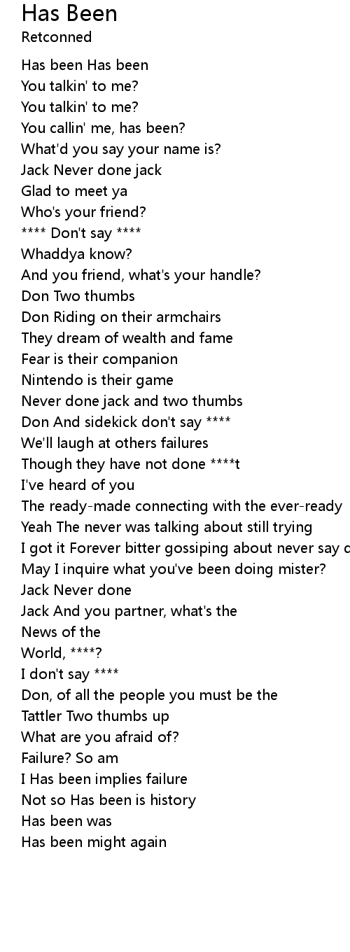 | You callin' me, has been? | |