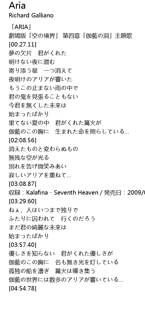 | [03:10.87] | 収録:Kalafina - Seventh Heaven/発売日:2009/03/04 |
