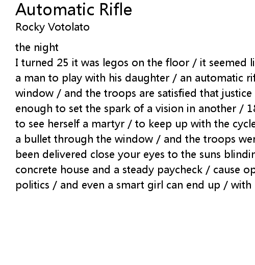 I turned 25 it was legos on the floor / it seemed like a safe enough game / for a man to play with his daughter / an automatic rifle and a bullet through the window / and the troops are satisfied that justice had been delivered that was enough to set the spark of a vision in another / 18 years - 18 year old girl - to see herself a martyr / to keep up with the cycle / of an automatic rifle and a bullet through the window / and the troops were satisfied that justice had been delivered close your eyes to the suns blinding light / a three story concrete house and a steady paycheck / cause open eyes will be / infected with politics / and even a smart girl can end up / with a bomb strapped to her chest |