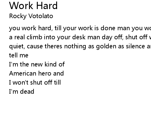 | you work hard, till your work is done man you work hard enough to be a man it's a real climb into your desk man day off, shut off when you can tell me to be quiet, cause theres nothing as golden as silence and work as hard as you can tell me | |