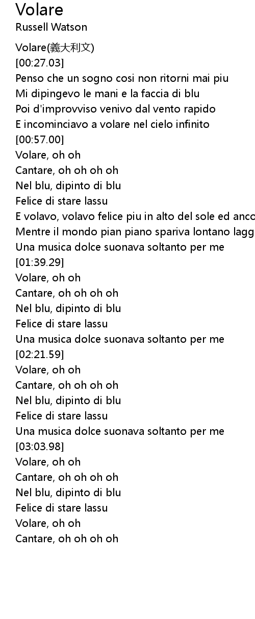 | [01:19.53] | E volavo, volavo felice piu in alto del sole ed ancora piu su |