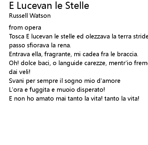 | Tosca E lucevan le stelle ed olezzava la terra stridea l'uscio dell'orto e un passo sfiorava la rena. | |