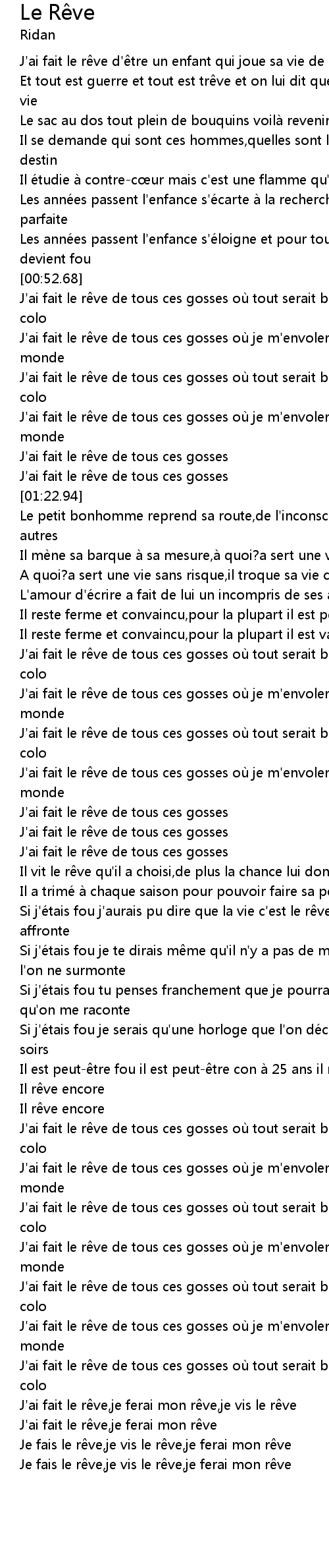 | [03:28.42] | J' ai fait le r ve de tous ces gosses ou tout serait beau comme une colo |