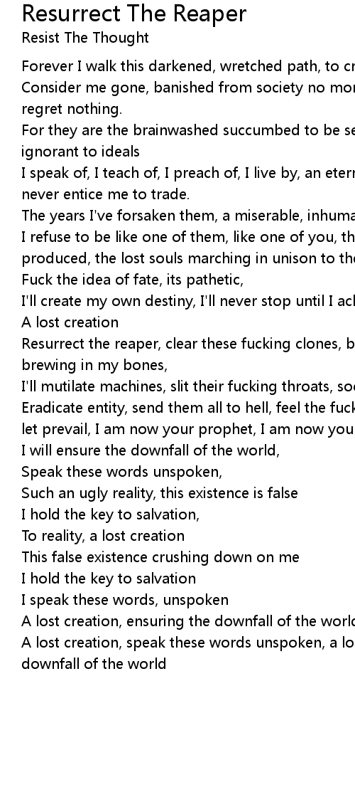 Resurrect the reaper, clear these fucking clones, bare witness to the bloodshed brewing in my bones, |