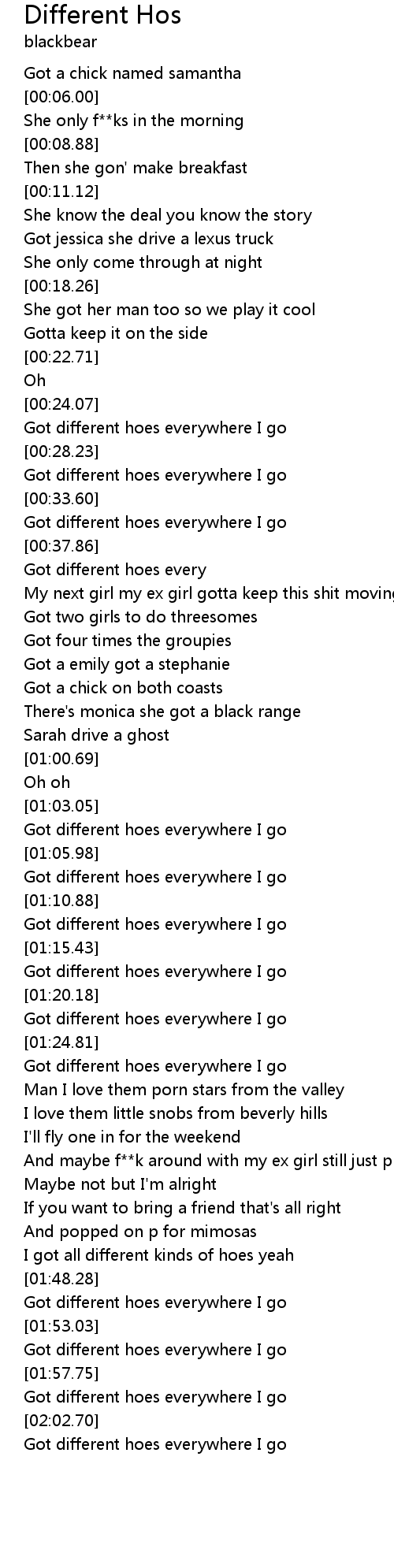 | [02:00.27] | Got different hoes everywhere I go |