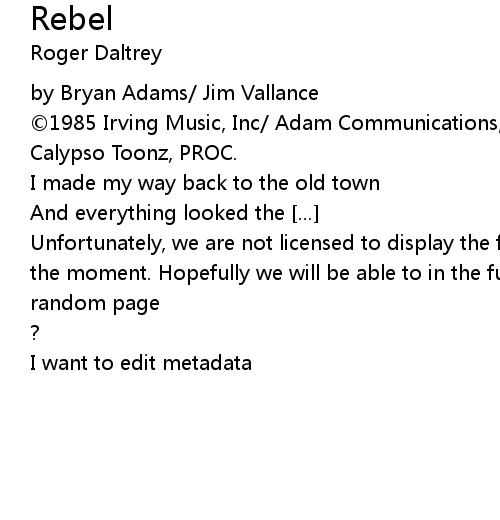 | Unfortunately, we are not licensed to display the full lyrics for this song at the moment. Hopefully we will be able to in the future. Until then, how about a | |