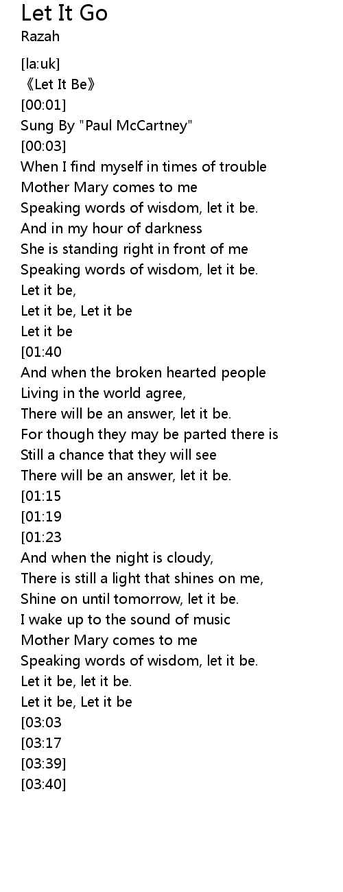 | [02:26][01:40][00:40] | Whisper words of wisdom, let it be. |