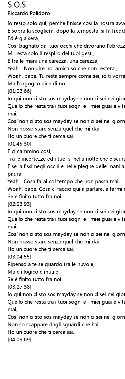 | [03:28.22] | Io qui non ci sto sos mayday se non ci sei nei giorni miei, |