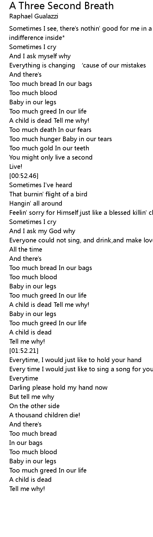 | [00:01.48] | Sometimes I see, there's nothin' good for me in a world with a big indifference inside* |