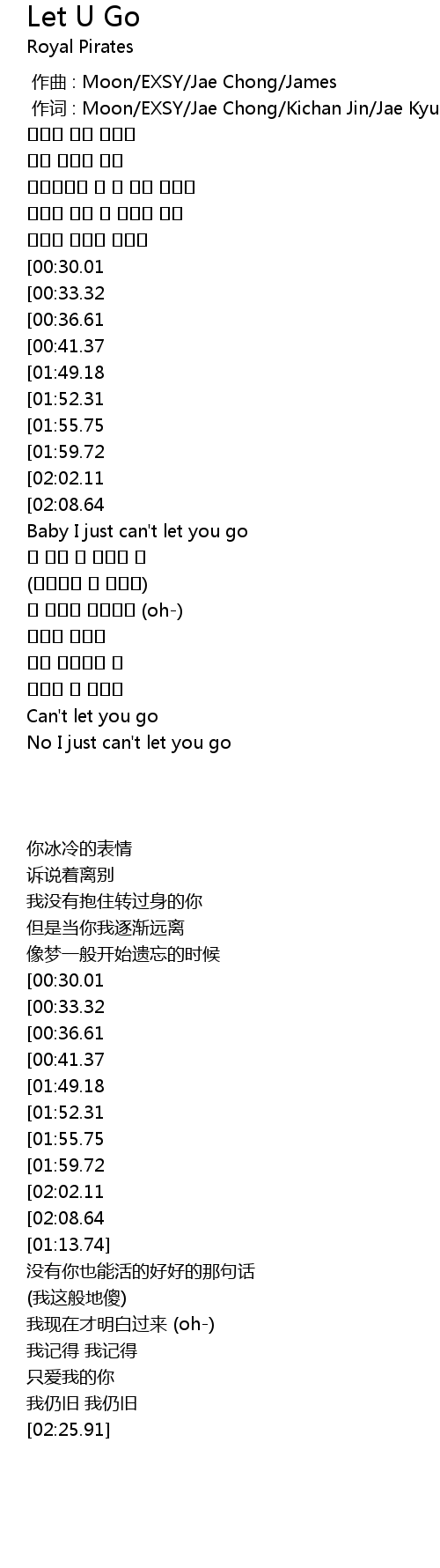 | [02:47.85][01:55.75][00:50.45] | Baby 날 떠나지 말아줘 |
