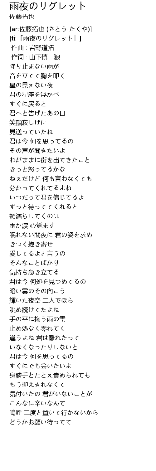 | [00:01.00] | 作词 : 山下慎一狼 |