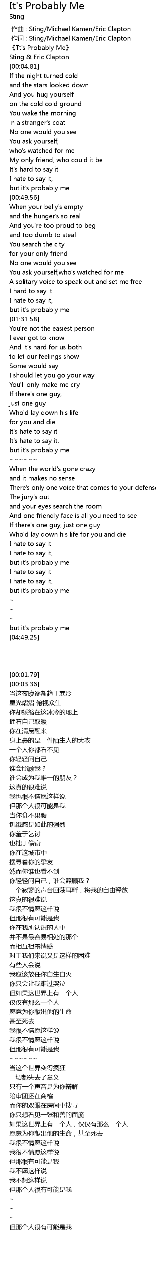 | [00:00.359] | 作词 : Sting/Michael Kamen/Eric Clapton |