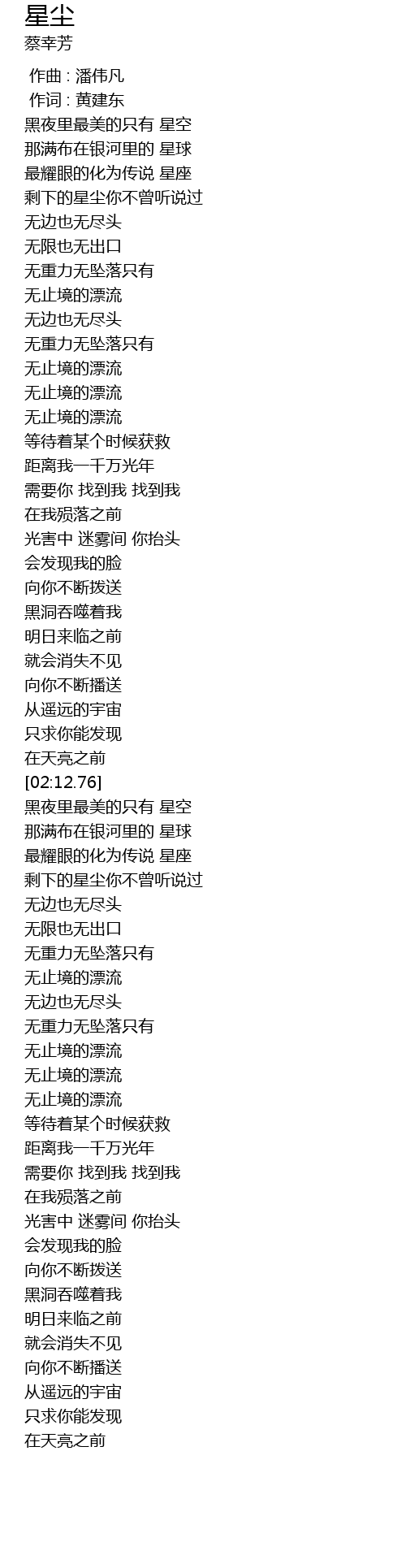 | [02:15.24] | 黑夜里最美的只有 星空 |