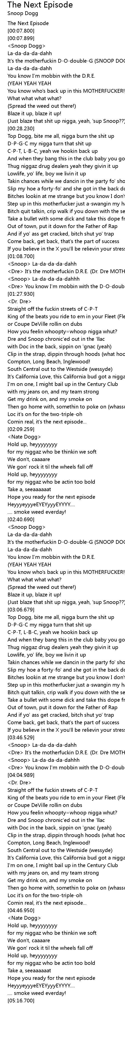 | [01:22.400] | <Dre> It's the motherfuckin D.R.E. (Dr. Dre MOTHERFUCKER!) |