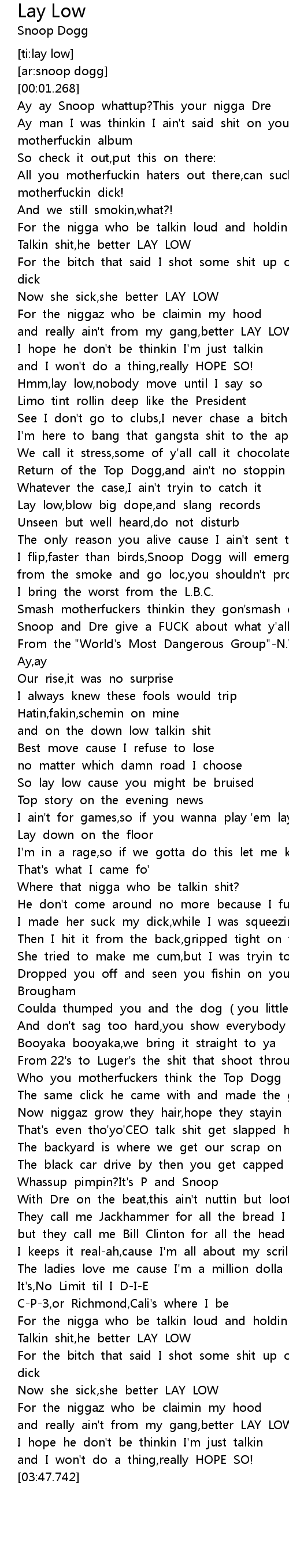 | [00:56.763] | and really ain' t from my gang, better LAY LOW |