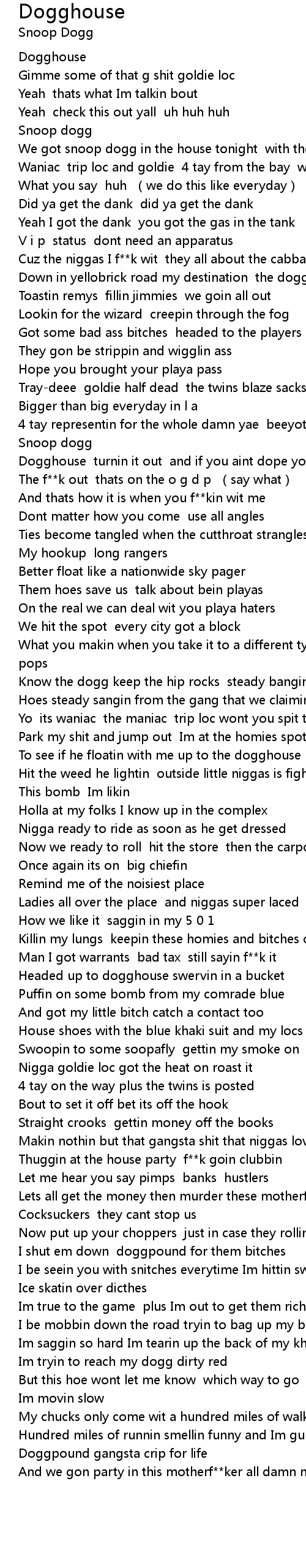 | [01:12.69] | Dogghouse turnin it out and if you aint dope you gots to get |