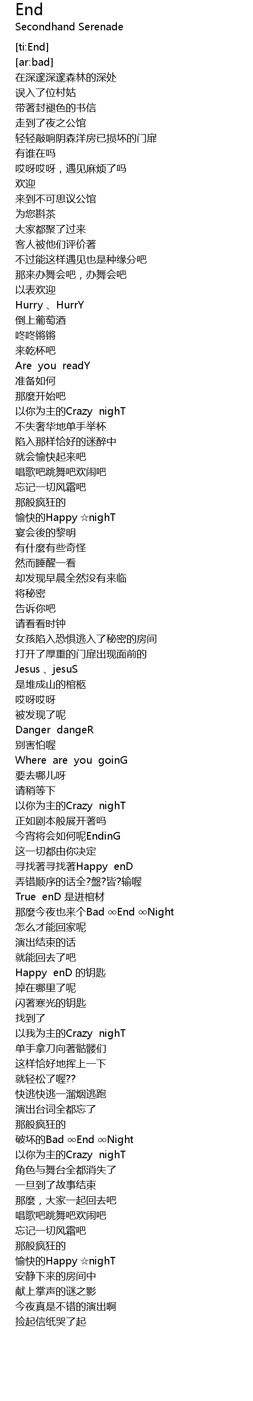 | [02:35.890] | nà me jīn yè yě lái gè Bad End Night |