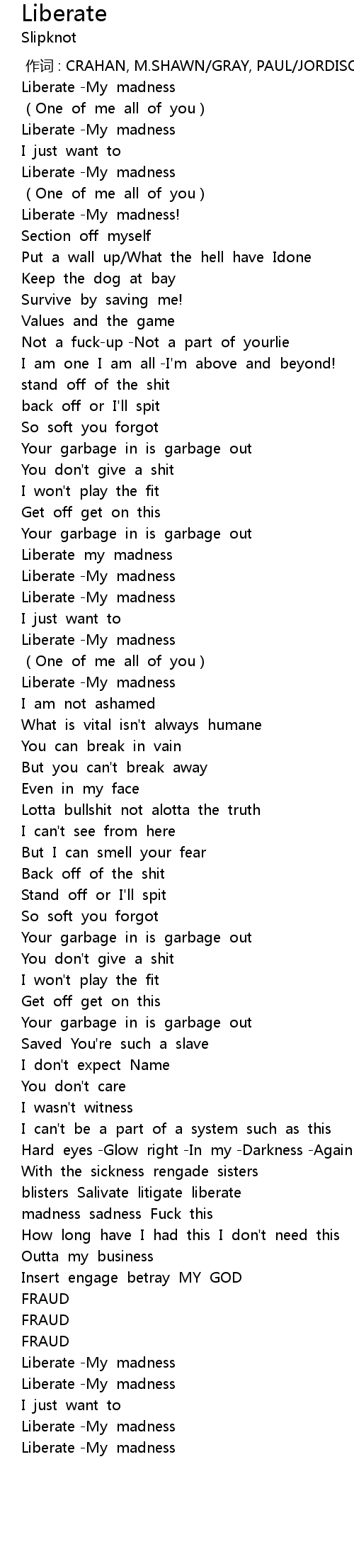 | [00:00.00] | 作词 : CRAHAN, M.SHAWN/GRAY, PAUL/JORDISON, NATHAN/TAYLOR, COREY |