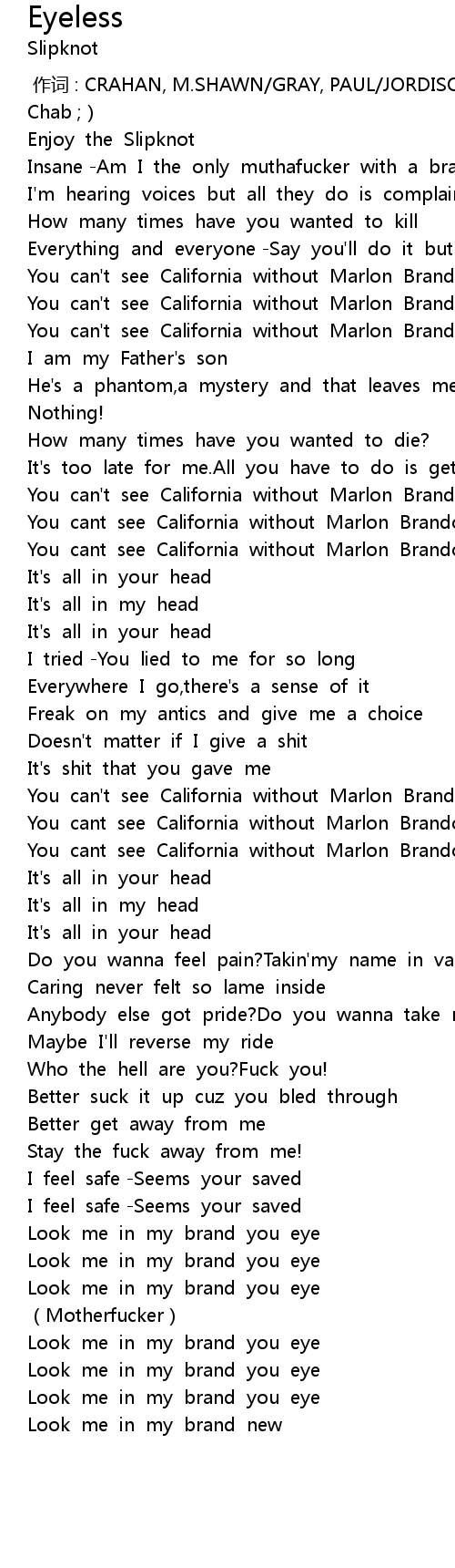| [00:00.00] | 作词 : CRAHAN, M.SHAWN/GRAY, PAUL/JORDISON, NATHAN/TAYLOR, COREY |