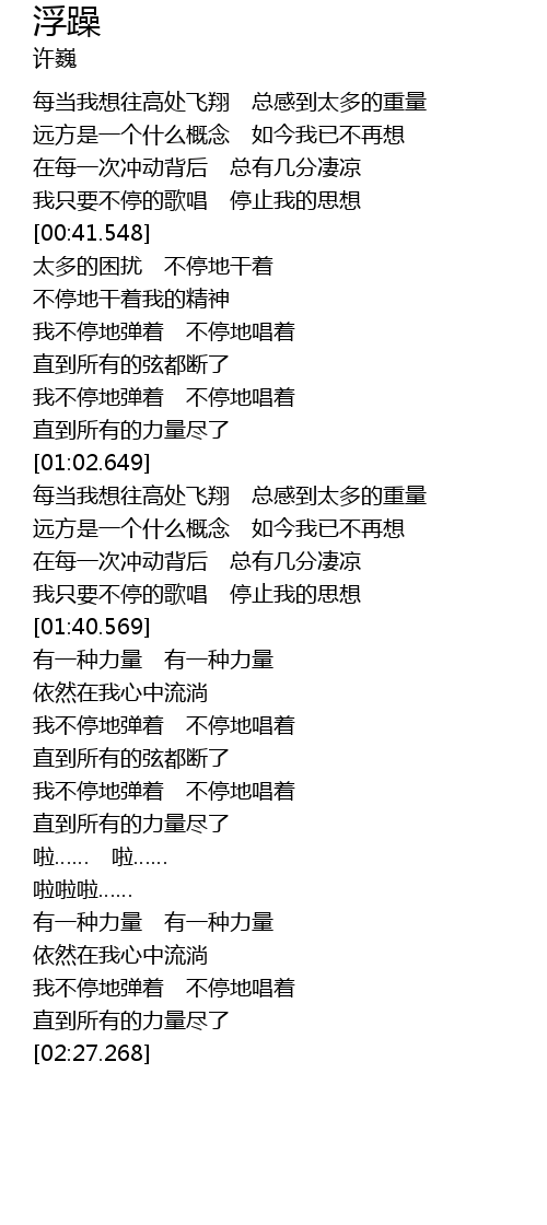 | [02:20.188] | 我不停地弹着 不停地唱着 |