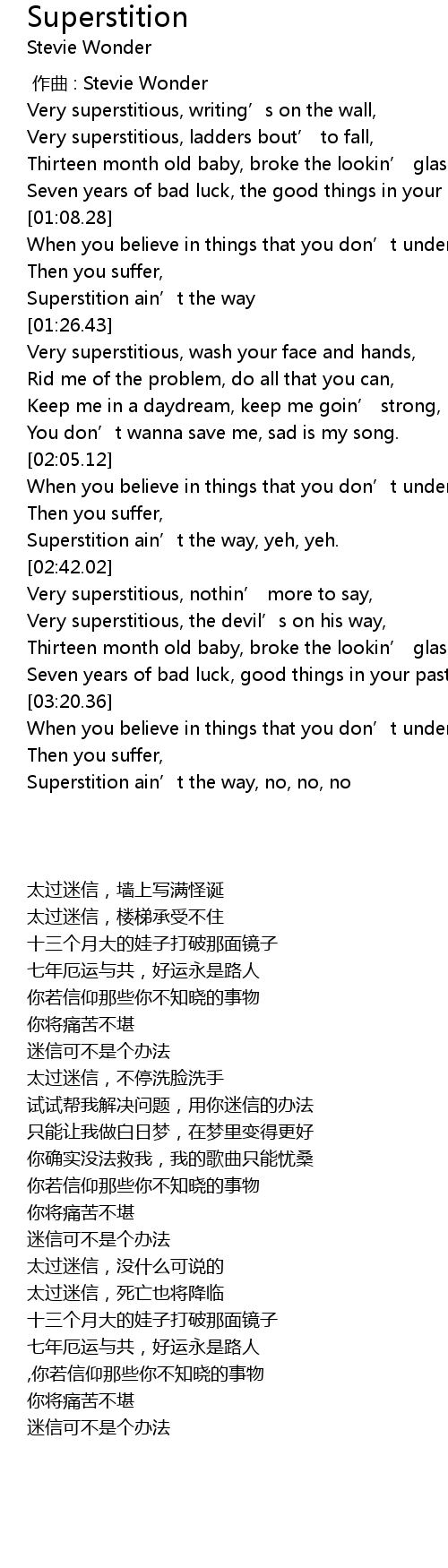 | [02:13.31] | Superstition ain' t the way, yeh, yeh. |