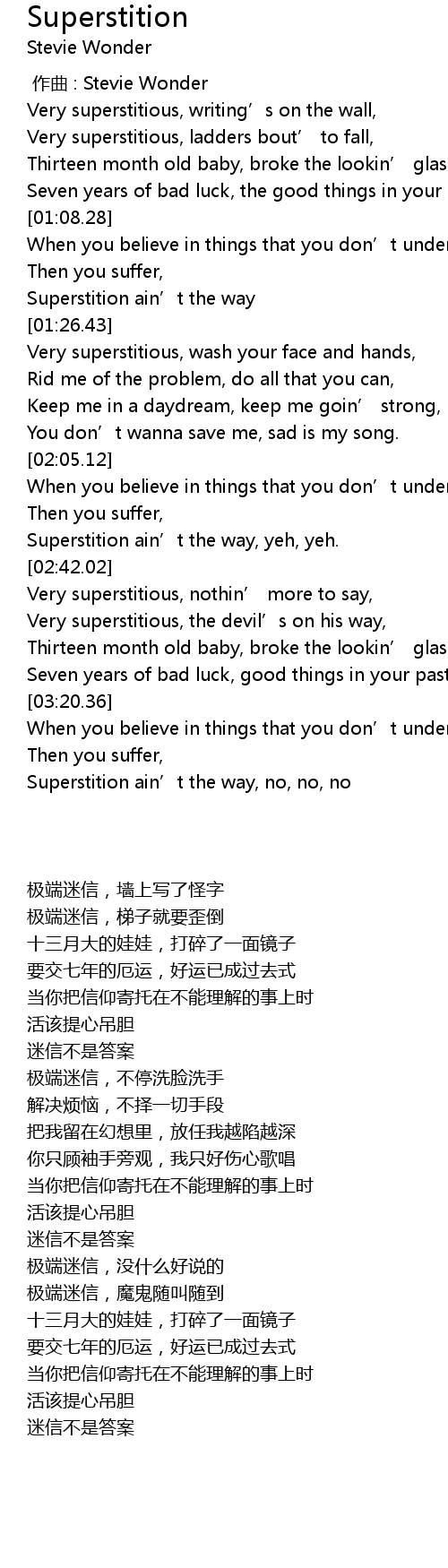 | [02:13.31] | Superstition ain' t the way, yeh, yeh. |