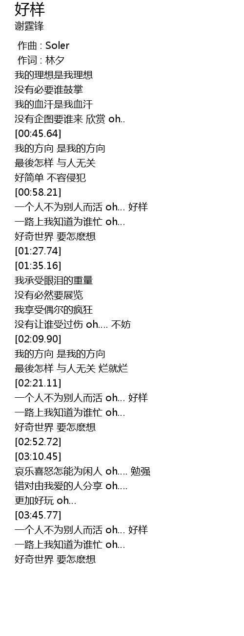 | [03:46.63] | 一个人不为别人而活 oh… 好样 |