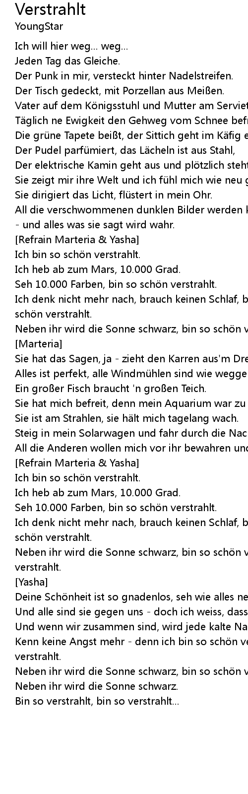 | Neben ihr wird die Sonne schwarz, bin so schön verstrahlt, bin so schön verstrahlt. | |