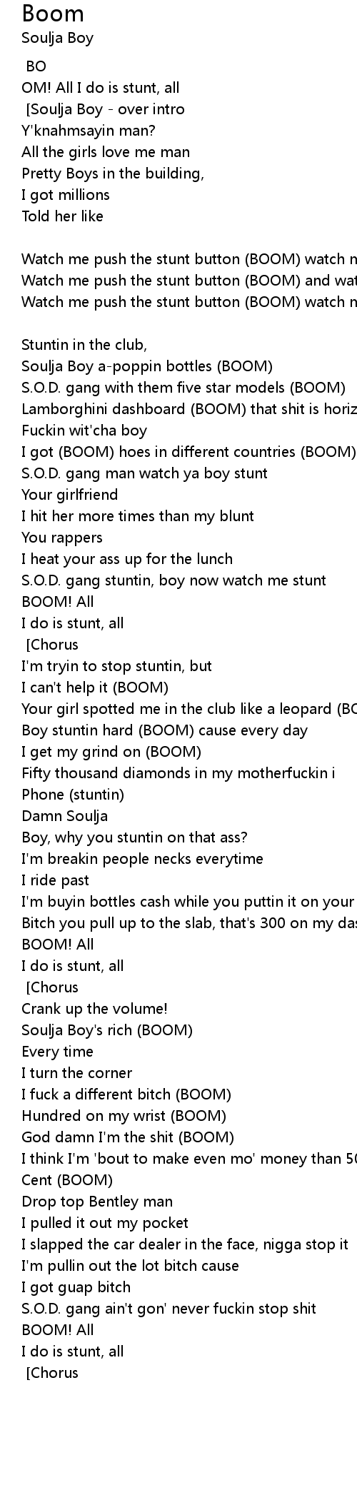Watch me push the stunt button (BOOM) watch me watch me stunt [Soulja Boy]