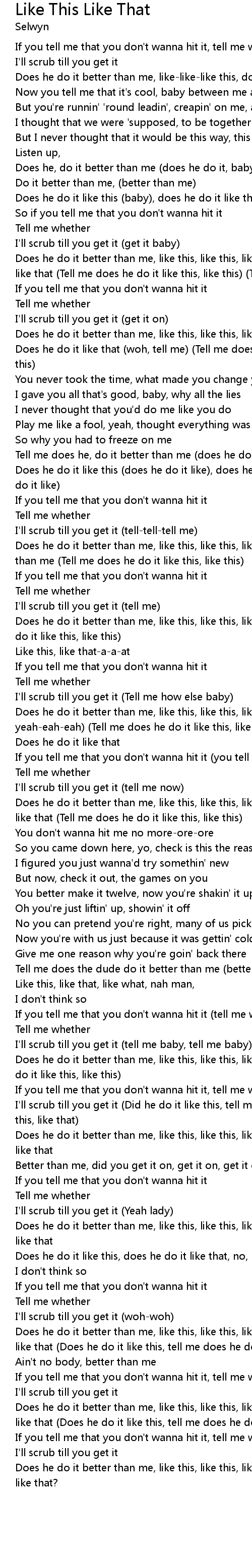 Does he do it better than me, like this, like this, like that, does he do it like that (Tell me does he do it like this, like this) (Tell me) |