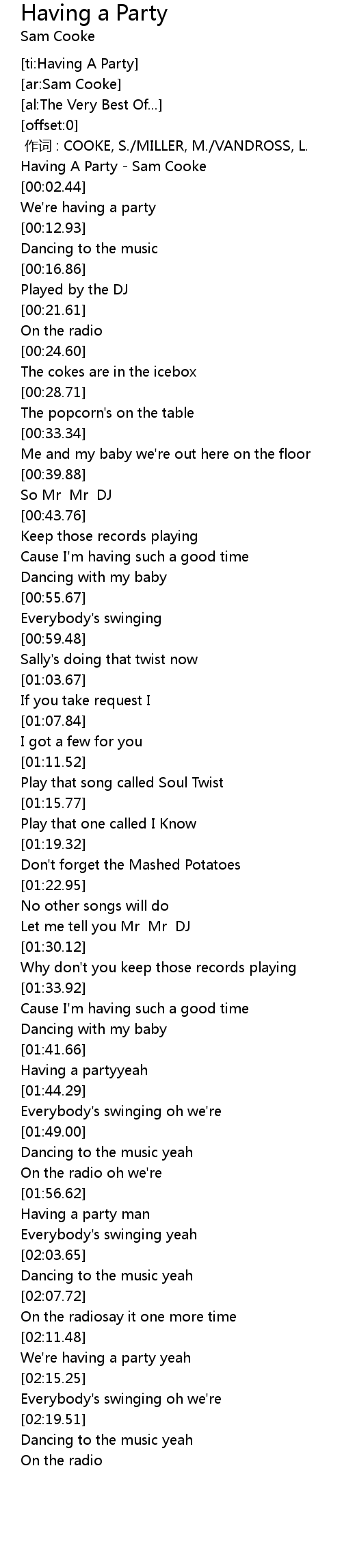 | [00:00.89] | Having A Party Sam Cooke |