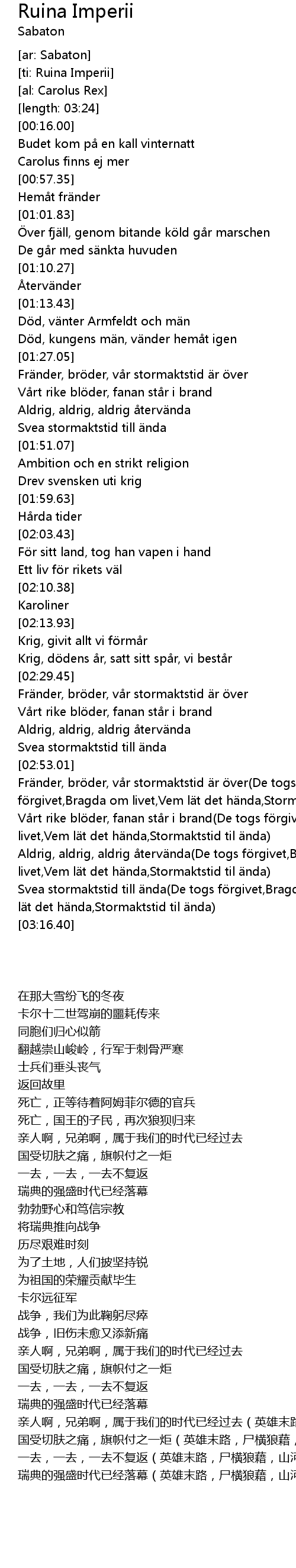 | [03:05.16] | Aldrig, aldrig, aldrig återvända(De togs förgivet,Bragda om livet,Vem lät det hända,Stormaktstid til ända) |