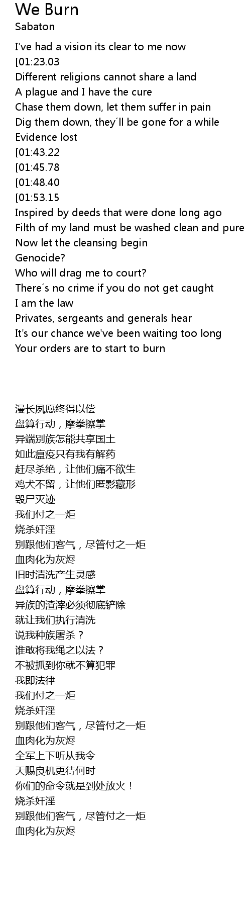| [01:09.15][01:48.40][02:43.78] | Show them no mercy, just burn |