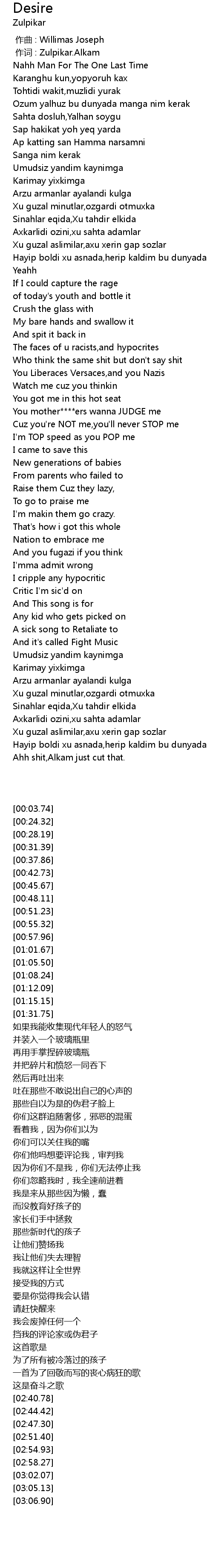 | [00:01.00] | 作词 : Zulpikar.Alkam |