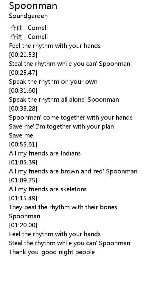 | [00:43.68] | Spoonman' come together with your hands |