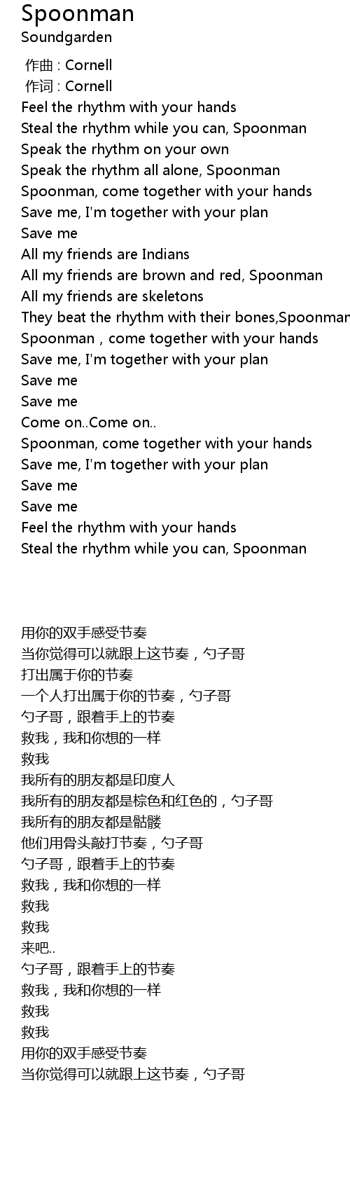 | [00:43.33] | Spoonman, come together with your hands |