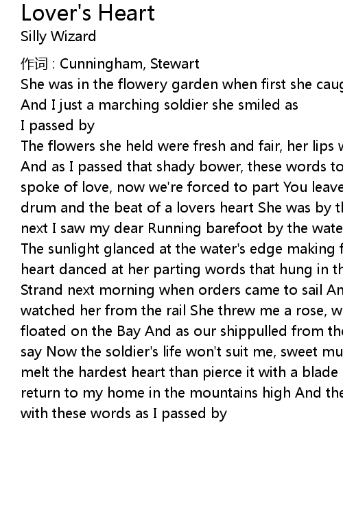 | And as I passed that shady bower, these words to me she said " Last night we spoke of love, now we' re forced to part You leave to the sound of a marching drum and the beat of a lovers heart She was by the shore in the evening when next I saw my dear Running barefoot by the waterside, she called as I drew near The sunlight glanced at the water' s edge making fire of her auburn hair My young heart danced at her parting words that hung in the evening air She was on the Strand next morning when orders came to sail And as we slipped our ropes away I watched her from the rail She threw me a rose, which fell between us, and floated on the Bay And as our shippulled from the shore, I heard her call and say Now the soldier' s life won' t suit me, sweet music is my trade For I' d rather melt the hardest heart than pierce it with a blade Let the time be short till I return to my home in the mountains high And the loving girl who stole my heart with these words as I passed by |