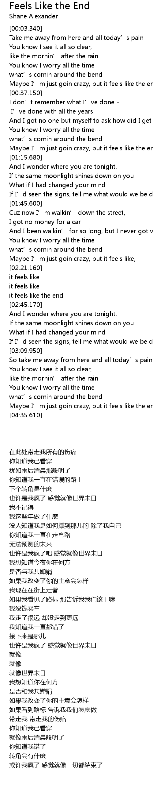 | [04:27.180] | Maybe I' m just goin crazy, but it feels like the end |